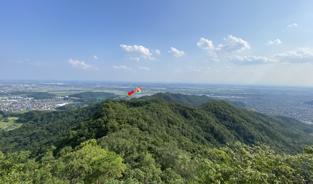 🏠マークの矢印の先に我が家があります。関東平野の端っこにあるのが分かります。