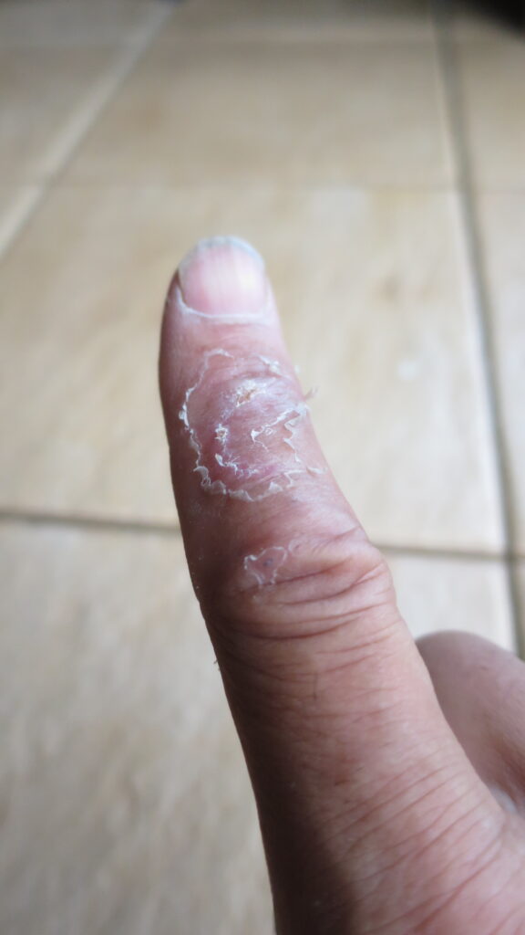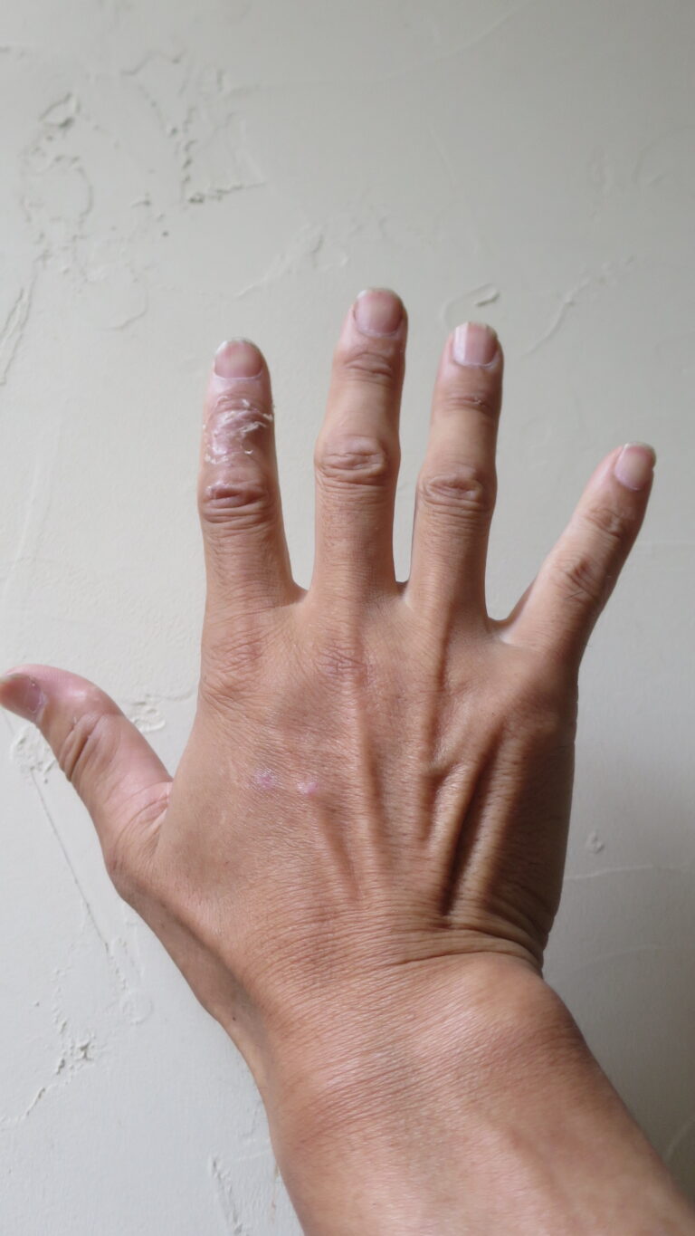 打撲創傷(4/4) 森林整備 2023.07.092023.08.13 2023年7月9日(Sun) 抜糸後13日目。ようやくかさぶたもとれて傷口がキレイになりました。曲げ伸ばしに違和感なし。ぶつけるとほかの部位より痛く感じます。
